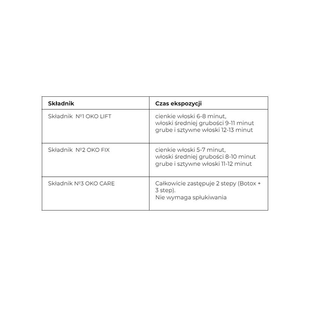 4. Nałóż №1 OkO LIFT na rzęsy/brwi za pomocą syntetycznego pędzelka lub microbrusha. W przypadku laminacji rzęs środek należy nałożyć w miejsce zagięcia wałka (najbardziej wypukła część). Rozprowadź produkt równomiernie nie gęstą warstwą na włosach, starając się jak najmniej kontaktować ze skórą. Można stosować pod folią lub bez. Czas utrzymywania od 6 do 13 minut (patrz tabliczka “Czas ekspozycji składników”). Maksymalny czas ekspozycji składników nie powinien przekraczać czasu ekspozycji dla wybranej grupy włosów. Sprawdzanie stanu włosów co 3-4 minuty. Włosy powinny wchłonąć składniki i stać się bardziej posłuszne. Po upływie czasu ekspozycji ostrożnie usunąć środek suchym wacikiem.